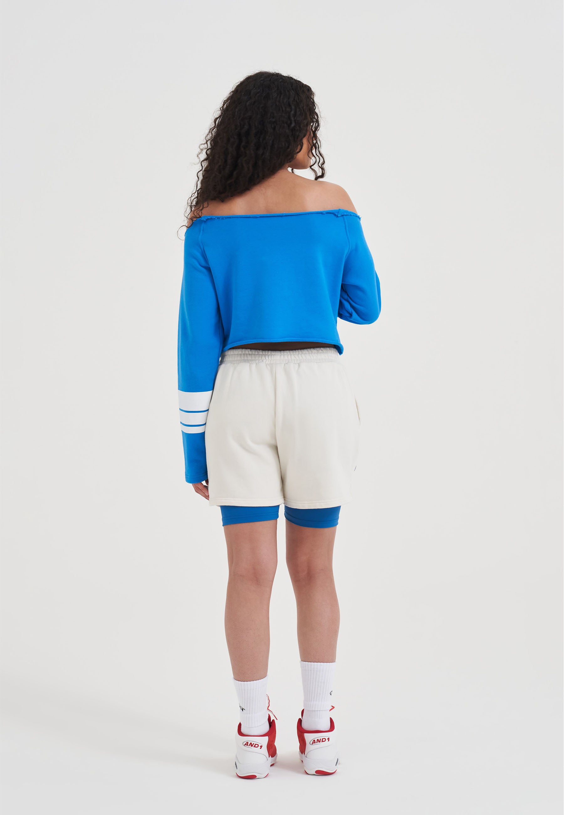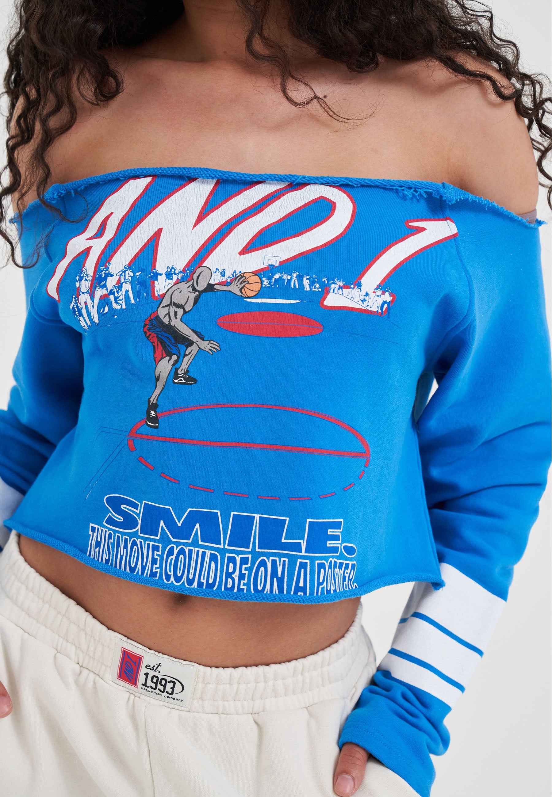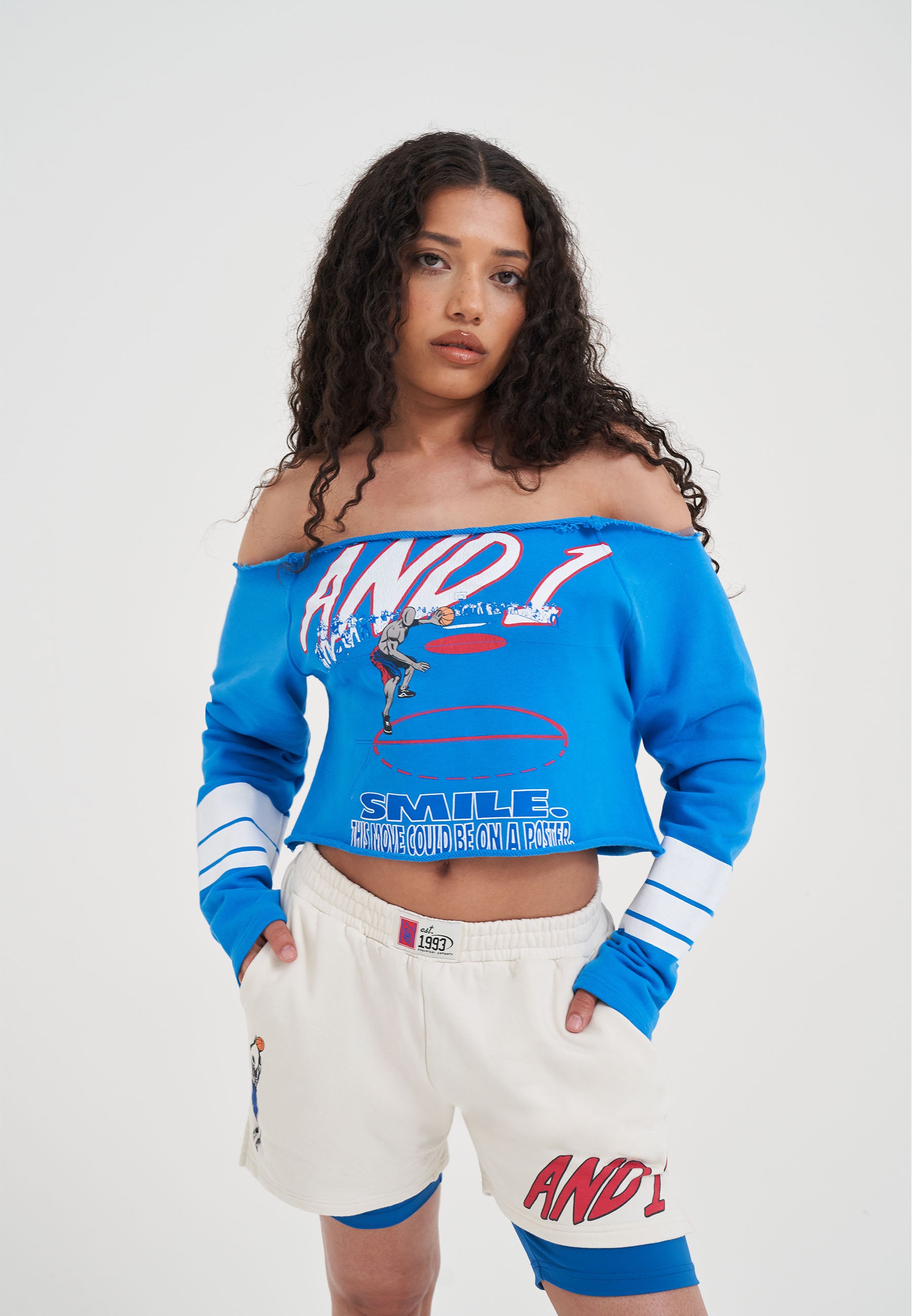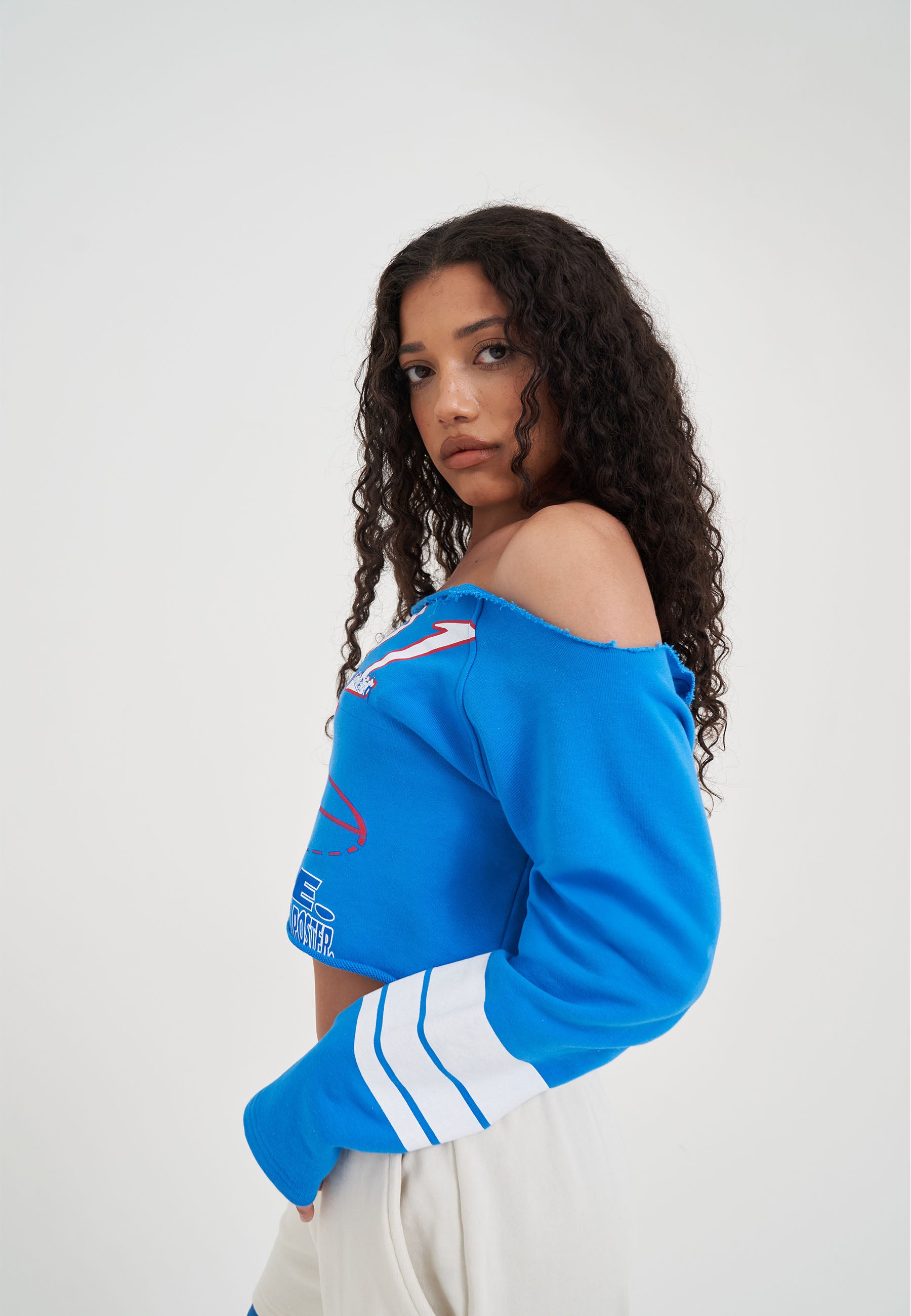 Womens Vintage Bardot Court Graphic Langarm-Top - Blau